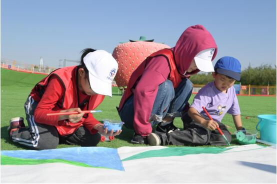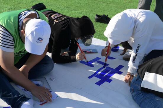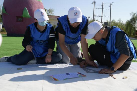 正午,伴著炎炎烈日,紅、黃、藍、綠四隊斗志昂揚,領取物料,小隊內部職能分工——繪畫組、外協(xié)組、涂色組。長6.8米、寬4米的納斯卡巨畫第一步驟極大的考驗大家的體力及細心程度,白色畫布在烈日的照耀下直晃人眼,但每個團隊的成員都極其有耐心的或爬、或跪、或蹲,在白畫上一筆一筆繪制網(wǎng)格,確定坐標,筆筆慎重,分毫必較,嚴謹、細致的工作態(tài)度讓人欽佩。這邊繪畫組緊張忙碌著,那邊外協(xié)組也沒有閑著,積極與其他團隊做好協(xié)商、交流,力爭四幅畫作在最終合體的時候能無縫對接。14:00-17:30,體力的消耗加上炎熱的天氣,沒有消磨隊員的斗志與毅力,歷經(jīng)3個多小時,四幅畫作全部完成,巨畫拼接,當“傳承、改變、革新、發(fā)展”精彩呈現(xiàn)的那一刻,每個隊員都成就感滿滿;當“奔跑吧,寧夏公路”的吶喊聲沖向云霄的時候,每個隊員都笑逐顏開、歡欣鼓舞。