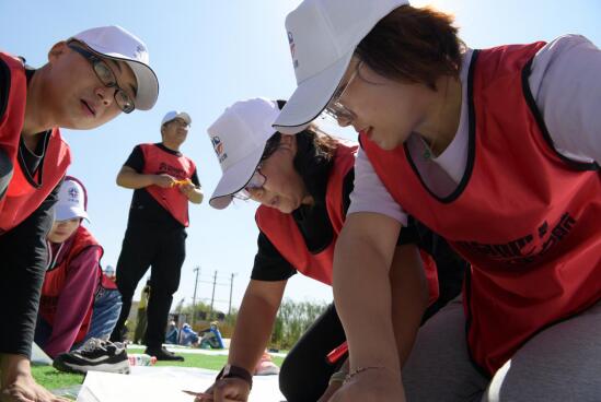 在總教練的指揮下,66人隨機分為紅、黃、藍、綠四隊。分隊結束后,各個團隊立即行動起來,選隊長、起隊名、畫隊旗、建隊呼,分別進行了各具特色、妙趣橫生的團隊亮相,彼時掌聲、笑聲此起彼伏,團隊默契度、向心力充分展現(xiàn)。