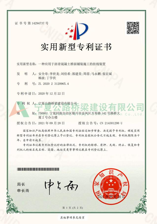 實(shí)用新型專利:一種應(yīng)用于瀝青混凝土橋面鋪裝施工的掛線裝置