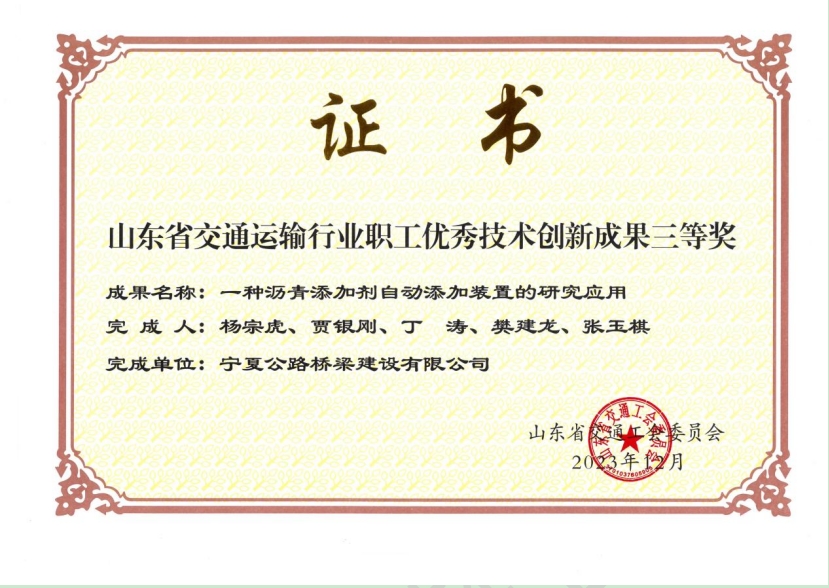 2023年,山東省交通工會結(jié)合工作實際,組織開展了山東省交通運輸行業(yè)全員創(chuàng)新企業(yè)、勞模工匠工作室、職工優(yōu)秀技術(shù)創(chuàng)新成果培育命名工作,由公司申報的《一種瀝青添加劑自動添加裝置的研究應(yīng)用》榮獲山東省交通運輸行業(yè)職工優(yōu)秀技術(shù)創(chuàng)新成果三等獎。