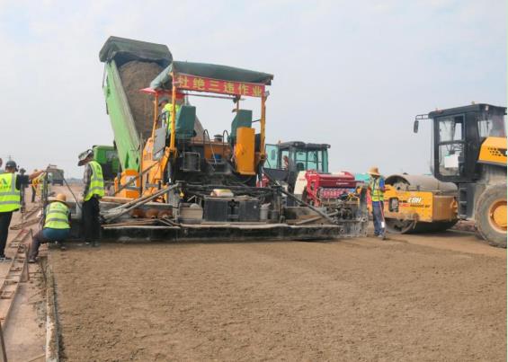 為確保此次水穩(wěn)底基層順利攤鋪,項目部始終堅持“技術檢測先行、管理高度落實、物料無縫銜接”的方針,通過精心籌劃、周密部署,合理配備人員、機械,并在施工前組織技術人員認真學習施工方案,嚴格把控原材料質量、優(yōu)化配合比、組織機械作業(yè)等關鍵環(huán)節(jié)。施工現(xiàn)場各類機械井然有序,各工序緊密銜接,形成了集運輸、攤鋪、碾壓“一體化”水穩(wěn)施工作業(yè)流水線。
