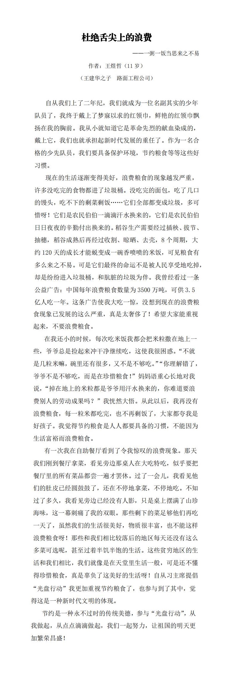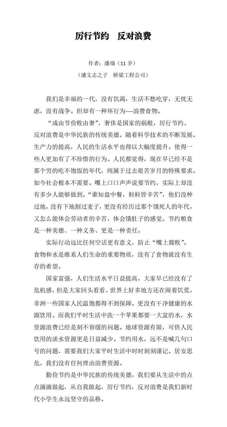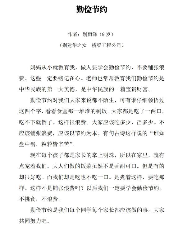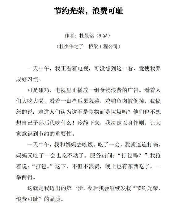 勤儉節(jié)約與愛惜糧食,自古以來是中華民族的優(yōu)良傳統(tǒng),在言傳身教中代代相承。青少年是祖國的未來、民族的希望,為深入貫徹落實(shí)習(xí)近平新時(shí)代中國特色社會(huì)主義思想,特別是習(xí)近平總書記關(guān)于加強(qiáng)促青少年成長成才等一系列重要論述,進(jìn)一步引導(dǎo)廣大青少年積極培育和踐行社會(huì)主義核心價(jià)值觀,寧夏公路橋梁建設(shè)有限公司面向員工子女開展“厲行節(jié)約、反對(duì)浪費(fèi)”有獎(jiǎng)?wù)魑摹?、美術(shù)比賽活動(dòng),傳承節(jié)儉惜食的中華民族傳統(tǒng)。10月22日本次比賽活動(dòng)圓滿結(jié)束,共有參賽作品32個(gè),其中征文作品14篇,美術(shù)作品14幅,書法作品4幅,經(jīng)評(píng)委評(píng)分,共選出征文小學(xué)組一等獎(jiǎng)2個(gè),中學(xué)組一等獎(jiǎng)2個(gè);美術(shù)幼兒組一等獎(jiǎng)1個(gè),小學(xué)組一等獎(jiǎng)1個(gè),中學(xué)組一等獎(jiǎng)1個(gè);由于書法參與人數(shù)較少,均給予優(yōu)秀獎(jiǎng);其他參賽作品分別給予參與獎(jiǎng)。