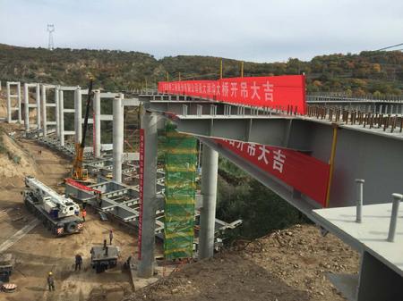 我公司承建的京藏高速公路改擴建段JZ15合同段,該標段的永寧黃河橋連接線分離立交主橋,為寧夏首座鋼—混組合箱梁橋。橋梁設計上部采用鋼—混凝土組合結(jié)構(gòu)連續(xù)箱梁,主梁高3.1m,最大跨徑65m,單節(jié)梁段最重79t、長39m。本工程為寧夏區(qū)內(nèi)單孔跨徑最大、建筑高度最高、單節(jié)梁最重、施工和吊裝難度最大的鋼混疊合梁橋,在技術(shù)和施工組織上有極具極大的挑戰(zhàn)性。