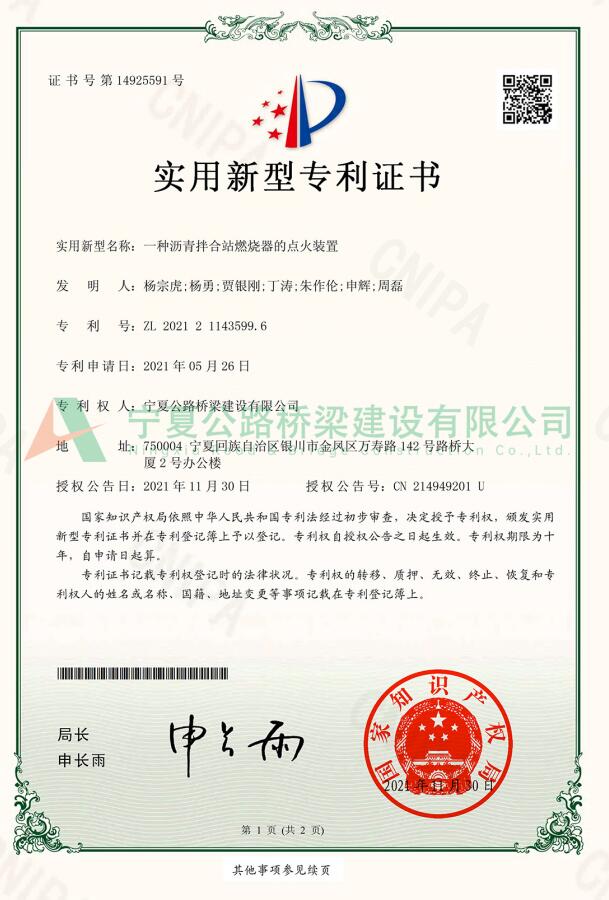 實(shí)用新型專利:一種瀝青拌合站燃燒器的點(diǎn)火裝置