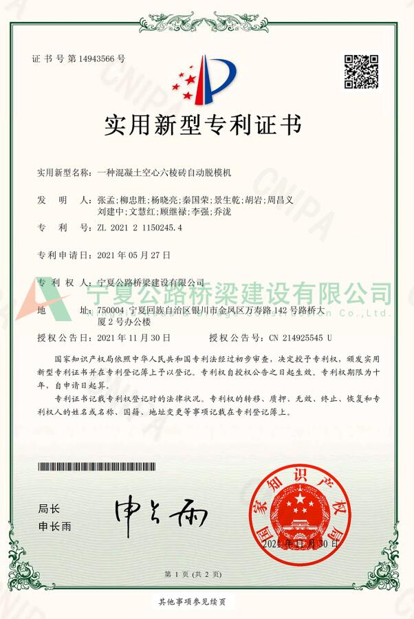 實用新型專利:一種混凝土空心六棱磚自動脫模機