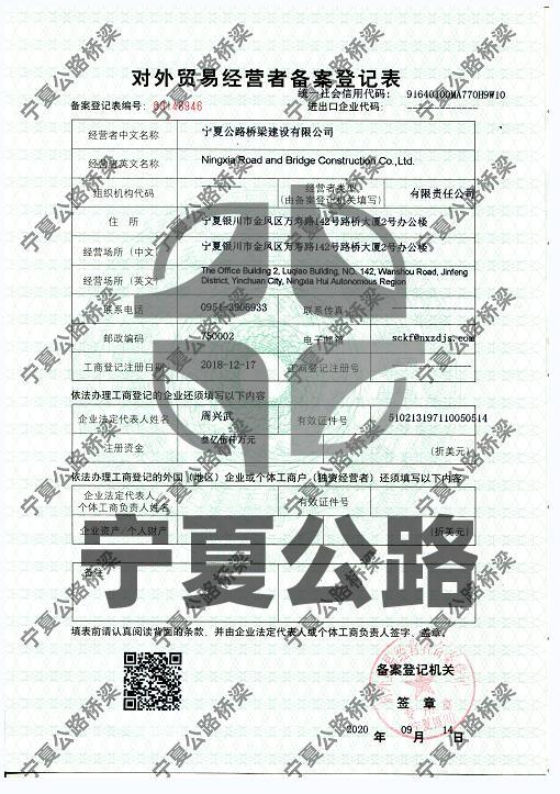 寧夏公路橋梁建設(shè)有限公司對外貿(mào)易經(jīng)營者備案登記表