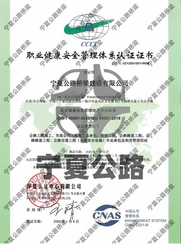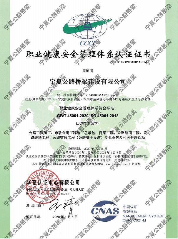 寧夏公路橋梁建設(shè)有限公司職業(yè)健康安全管理體系認證證書