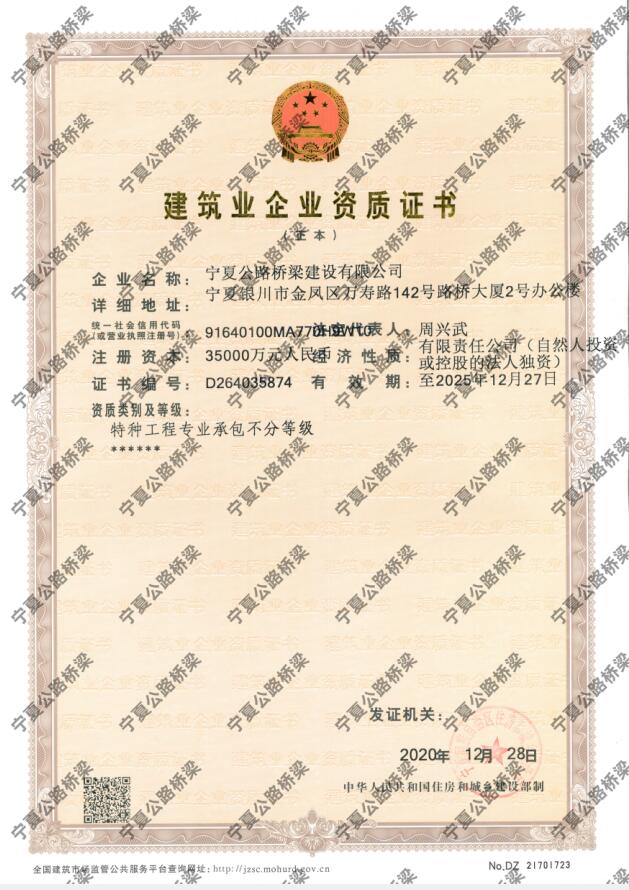寧夏公路橋梁建設(shè)有限公司建筑業(yè)企業(yè)資質(zhì)證書