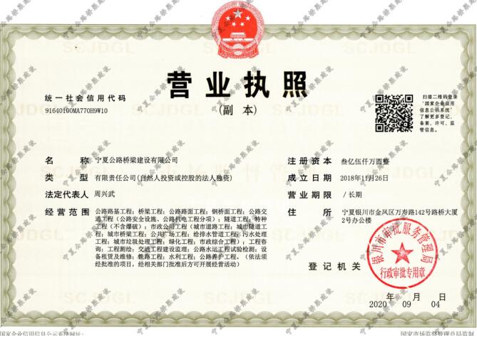 為更好地適應(yīng)市場(chǎng)開發(fā)新形勢(shì),傳承企業(yè)發(fā)展歷史在區(qū)內(nèi)乃至全國(guó)公路建設(shè)市場(chǎng)良好的口碑和聲譽(yù),為公司創(chuàng)造有利、順暢的市場(chǎng)開拓優(yōu)勢(shì),公司已將“寧夏中達(dá)公路建設(shè)有限公司”更名為“寧夏公路橋梁建設(shè)有限公司”。
