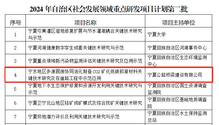 近日,寧夏回族自治區(qū)科學(xué)技術(shù)廳下達了《2024年社會發(fā)展領(lǐng)域重點研發(fā)項目第二批計劃的通知》,由公司主持申報的《寧東地區(qū)多源固廢協(xié)同活化制備CO2礦化低碳膠凝材料關(guān)鍵技術(shù)研究及在道路工程中示范應(yīng)用》項目經(jīng)過嚴(yán)格評審與層層篩選,由寧夏回族自治區(qū)科學(xué)技術(shù)廳批準(zhǔn),順利立項。