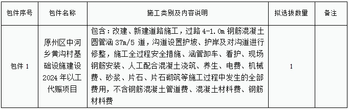 本次采購本項目包件1 原州區(qū)中河鄉(xiāng)黃溝村基礎(chǔ)設(shè)施建設(shè)2024年以工代賑項目施工。包含內(nèi)容為改建、新建道路施工,過路4-1.0m鋼筋混凝土圓管涵 37m/5 道,溝道設(shè)置護(hù)坡、護(hù)岸及對溝道進(jìn)行修整。