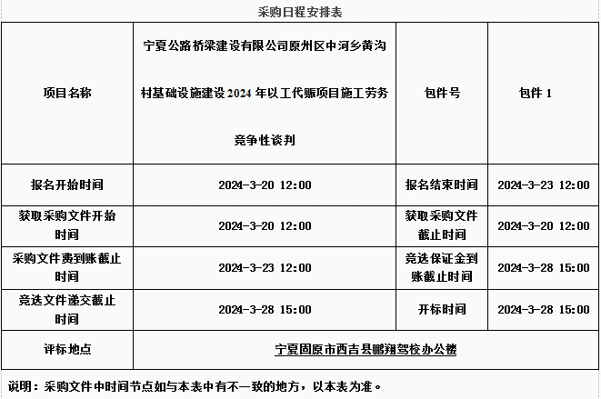 采 購 人:寧夏公路橋梁建設(shè)有限公司原州區(qū)中河鄉(xiāng)黃溝村基礎(chǔ)設(shè)施建設(shè)2024年以工代賑項目一標(biāo)段項目經(jīng)理部